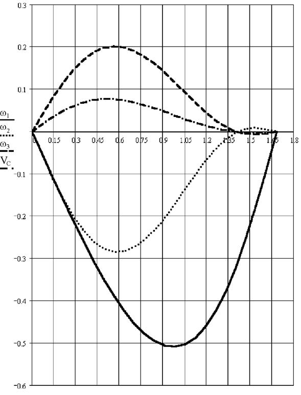 На печать с шагом Dt = t/24 = 0,07 c выводятся переменные t, j1, j2, j3, w1, w2, w3 и VC. Ниже представлена программа и результаты расчета на языке Pascal (табл. К4.3), а также график изменения скоростей в зависимости от времени (рис. К4д).
