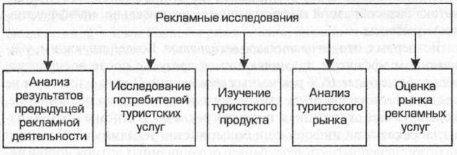 Сущность рекламных исследований Осуществляемые на первом, подготовительном этапе рекламной деятельности туристского предприятия рекламные исследования являются разновидностью маркетинговых. Более того, исследования по данным направлениям осуществляются параллельно, в рамках единой системы. Несмотря на то что в каждом конкретном случае структура рекламного исследования будет индивидуальна, можно говорить по крайней мере о пяти обязательных этапах: 1. Определение целей и задач рекламного исследования. 2. Отбор источников информации. 3. Сбор информации. 4. Анализ собранной информации. 5. Представление результатов исследования. Исходным пунктом рекламного исследования (как и других маркетинговых исследований) является определение целей и задач. Они прямо вытекают из специфики проблемы, актуальной для рекламной деятельности туристского предприятия. На основании обозначенных целей и задач исследования осуществляется отбор источников информации. Правильный выбор источников освобождает от излишних усилий по сбору данных, бесцельных поисков нужных сведений там, где их заведомо не может быть. Основным принципом отбора источников является представление необходимой внутрифирменной, внешней и первичной информации с максимальной быстротой и эффективностью. Сбор информации ведется по ряду направлений: •результаты предыдущей рекламной деятельности; •потребители туристских услуг; •туристский продукт; •туристский рынок; •рынок рекламных услуг. Детальное рассмотрение указанных направлений рекламных исследований туристского предприятия представлено в параграфе 3.3. Анализ собранной информации предполагает ее изучение, обработку с помощью различных методов (экономико-статистических и экономико-математических) и приемов, а также извлечение необходимых сведений из всего массива полученных данных. Представление результатов исследования предполагает разработку выводов и рекомендаций. Они должны непосредственно вытекать из результатов анализа, быть аргументированными и достоверными, направленными на решение поставленных целей рекламной деятельности туристского предприятия. Рассмотрим основные направления рекламных исследований (рис. 3.1).