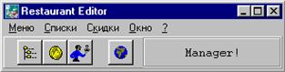 Рис.4. Всплывающее меню для приложения Меню ресторана Помощь. Все приложения R-Keeper снабжены электронной системой помощи. Помощь можно вызвать по нажатию клавиши F1 на клавиатуре. Система помощи является контекстной, т. е содержание страницы подсказки зависит от того, на какой форме приложения вызвали помощь. Создание и корректировка основных словарей кассовой системы осуществляется менеджером в приложении Restaurant Editor. Вид главного меню системы представлен на рисунке 5.