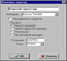 Рис. 16. Сервис - принтеры Для ввода карточки сервис - принтера выберите операцию редактирования “Новый принтер” или воспользуйтесь специальной кнопкой. На экране появится карточка Сервис - принтера, вид экрана представлен на рисунке 17. В поле “Наименование” определите условное наименование сервис-принтера. Для этого можно использовать любые символы. Максимальная длина поля составляет 20 символов. В поле “Аппарат” определяется модель используемого принтера. Если потоки организованы таким образом, что отправляемый со станции заказ, включающий в себя блюда из различных групп печати, печатается на одном принтере, то при установке флага в поле “Объединять группы” на этот заказ будет печататься один чек. В противном случае на каждую группу печати на сервис - принтере будет печататься отдельный чек. Порядок, в котором будут печататься блюда из разных групп печати, зависит от порядка расположения в списке групп сервис - печати. Установите переключатель “Печать” в нужное положение: § Через сервер – заказ отправляется на кассовый сервер, который, в свою очередь, отправляет его на печать; § Через другой сервер – заказ отправляется на кассовый сервер, который пересылает его на другой кассовый сервер, который, в свою очередь, отправляет его на печать. § Локально – заказ печатается на принтере непосредственно подсоединенном к станции. В случае неготовности принтера, выдается сообщение об ошибке; § На сетевой ресурс – заказ печатается на принтере непосредственно подсоединенном к другой станции, по сети. В случае неготовности принтера, выдается сообщение об ошибке.