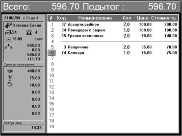 Например, довольно часто гость ресторана делает сразу весь заказ. Для того чтобы заказ на десерт на кухне выполнили позже, необходимо сообщить об этом на кухню. Для этого нажмите клавишу [Черта]. На экране появится черта, как показано на рисунке 76. Эта черта служит для обозначения того, что блюда, введенные в счёт поcле черты, необходимо подать гостю позже чем основной заказ.