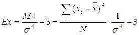 где N - объем совокупности. Отношение ç As ç/ sAs , дающее значение меньше 2, свидетельствует о несущественном характере асимметрии. Коэффициент эксцесса, Ex - показатель островершинности распределения. Он рассчитывается для симметричных распределений. Эксцесс представляет собой выпад вершины эмпирического распределения вверх или вниз от вершины кривой нормального распределения. Наиболее точным является показатель, использующий центральный момент четвертого порядка - М 4:
