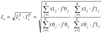 Если один из сомножителей показатель качественный, а другой - объемный, то, как уже было отмечено, индекс качественного показателя определяется по текущим значениям объемного показателя. Общая стоимость продукции равна произведению цены за единицу продукции на физический объем выпуска: ∑S = ∑p·q. Тогда сводный индекс стоимости должен быть равен произведению сводного индекса цен на сводный индекс физического объема Is = Ip·Iq. Чтобы выполнялось данное условие необходимо, чтобы веса при построении индексов цен и физического объема относились к разным уровням. Принято вычислять индекс цен по формуле Пааше, а индекс физического объема по формуле Ласпейреса: