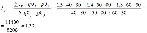 При построении сводных индексов объемных показателей используется формула среднего арифметического взвешенного по базисным значениям результата. Сводный индекс физического объема продукции рассчитывается как среднее арифметическое из индивидуальных индексов (iq), взвешенное по базисной стоимости (p0q0):