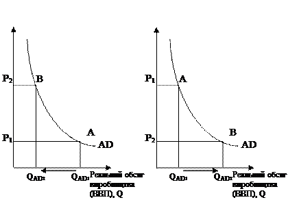 Характеристика обсягу національного виробництва. Макроекономічна рівновага. Збереження рівноваги між різними процесами в економіці країни є умовою її нормального функціонування, якщо дивитись на проблему рівноваги з точки зору співвідношення доходів та витрат. Сукупні видатки – це загальна сума видатків усіх покупців на кінцеві товари і послуги, вироблені національною економікою. Сукупні видатки складаються з чотирьох компонентів – споживчих видатків домогосподарств (С), інвестиційних видатків фірм (І), державних закупівель товарів і послуг (G) та чистого експорту (Х). На ринку в реальних умовах зустрічаються не окремі виробники і споживачі конкретних товарів, а величезна кількість продавців і покупців: тих, хто володіє відповідними коштами та прагне придбати певні товари. Як наслідок, ціни на всі товари встановлюються в результаті масових, а не поодиноких угод покупців і продавців. Тому можемо говорити про сукупний попит та сукупну пропозицію в межах національного ринку. Сукупний попит (AD) – це шкала, що графічно представлена у вигляді кривої, яка показує величину реального обсягу продукції – різні кількості товарів і послуг, що їх покупці бажають придбати за кожного можливого рівня цін (інші умови залишаються незмінними). Сукупний попит відображає величину сукупних видатків за кожного можливого рівня цін. Величина сукупного попиту змінюється під впливом динаміки цін. Чим вищий рівень цін, тим менше реальних грошей у споживачів і, відповідно, меншу кількість товарів та послуг вони готові купити (рис. 3.1.1, а). І, навпаки, зниження загального рівня цін сприяє збільшенню обсягу попиту на реальний обсяг виробництва (рис. 3.1.1, б).