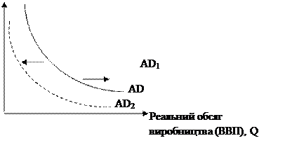 а) б) Рисунок 3.1.1 – Вплив цінових чинників на сукупний попит На сукупний попит також можуть впливати нецінові чинники: - політико–економічні (монетарна, фіскальна політика); - зовнішні (обсяг виробництва в інших країнах, вартість активів, ціни на ресурси); - сподівання споживачів та підприємців на зміни у майбутньому. Збільшення сукупного попиту, викликане неціновими чинниками сукупного попиту, переміщує криву AD вправо в положення AD1. І, навпаки, зменшення сукупного попиту переміщує криву вліво в положення AD2. (рис. 3.1.2)