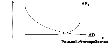 Крива довгострокової сукупної пропозиції (ASд, рис. 3.1.3) показує обсяг виробництва, який називають природним рівнем виробництва. Він не залежить від зміни рівня цін: при одночасному підвищенні всіх цін загальна кількість запропонованих товарів і послуг не змінюється через те, що всі ресурси вже використовуються. Цей рівень досягається за повної зайнятості (природної норми безробіття) і залежить від кількості наявних ресурсів (капіталу, праці, технологій). Тому всі чинники, які змінюють природний рівень виробництва, переміщують криву довгострокової пропозиції вправо або вліво. Крива короткострокової сукупної пропозиції є висхідною (ASк, рис. 3.1.3). Деякі економісти вважають, що крива короткострокової сукупної пропозиції має три відрізки – кейнсіанський (горизонтальний), проміжний та класичний (майже вертикальний). Кейнсіанський відрізок відбиває ситуацію, коли економіка перебуває у стані спаду і значна частка виробничих потужностей не використовується. Обсяг національного продукту ще такий невеликий, що його збільшення не супроводжується виникненням дефіциту ресурсів або слабин у виробництві, котрі стимулюють зростання цін. Люди, які місяцями були без роботи не вимагають підвищення зарплати одразу після повернення на робочі місця. Оскільки підприємці можуть отримати працю та інші вхідні ресурси за більш-менш стабільними цінами, витрати виробництва за збільшення його обсягу не зростають і немає причин для підвищення рівня цін на товари і послуги.
