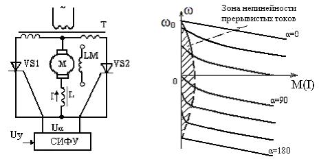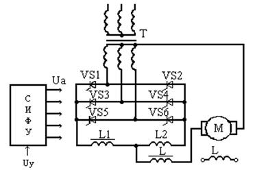 Преобразователь включает в себя в общем случае согласующий трансформатор Т, два тиристора VS1 и VS2, сглаживающий дроссель L и систему импульсно-фазового управления (СИФУ). Преобразователь обеспечивает регулирование напряжения на Д за счёт изменения среднего значения ЭДС преобразователя. Это достигается регулированием с помощью СИФУ угла управления