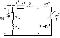 Для получения электромеханических и механических характеристик асинхронного двигателя (АД) мы будем использовать схему замещения асинхронного двигателя, позволяющую объединить первичную и вторичную цепь двигателя на одной схеме [1; 9; 10]. На схеме замещения (рис. 5.1) каждая из цепей представлена своими активными и индуктивными сопротивлениями. При этом ток, ЭДС и параметры цепи ротора пересчитаны (приведены) к цепи статора, что и позволяет представить цепь статора и цепь ротора на схеме замещения соединенными электрически. Приведение параметров ротора к обмотке статора осуществляется на основании закона сохранения энергии с помощью коэффициента трансформации АД.