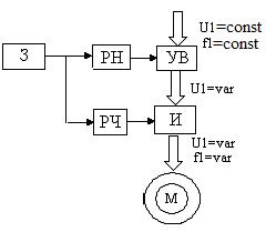 Рис. 5.9. Функциональная схема преобразователя частоты со звеном постоянного тока: УВ- управляемый выпрямитель; И– инвертор; РН- регулятор напряжения; РЧ- регулятор частоты; З- задатчик
