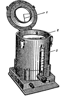 Мал. 1. Прилад Кротова для бактеріологічного дослідження повітря (1 – клиновидна щілина; 2 – обертальний диск; 3 - реометр)