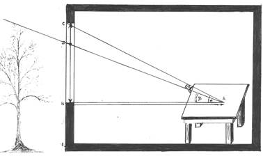 Мал. Схема визначення кута падіння та кута отвору У зв’язку з тим, що цей кут утворює з лінією засклення вікна прямокутний трикутник, то його визначають за тангенсом – відношенням висоти вікна ВС над рівнем робочого місця (протилежний катет) до відстані від вікна до робочого місця АВ (прилеглий катет). За значенням тангенсу в таблиці 3 знаходять кут падіння a. tg a = ВС/АВ Визначення кута отвору g (кута САD, під яким з робочої точки видно ділянку неба). Цей кут визначають як різницю між кутом падіння a та кутом затінення b-кутом DАВ на робочому ж місці між горизонталлю та площиною від робочого місця до вершини затінюючого об’єкта – будівлі, дерев, гір (див. мал.). Для визначення кута затінення знаходять на вікні точку перетину лінії (чи площини) від робочого місця до вершини затінюючого об’єкту Д, ділять величину катета ВД на АВ (тангенс кута затінення), а в таблиці знаходять кут затінення b. tg b = ВД/АВ кут отвору – g =Ða - Ðb