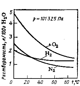Рис.4. Залежність розчинності газів у воді від температури Таблиця 1.5 Розчинність газів у воді при різних температурах, м3 газу/м3 води