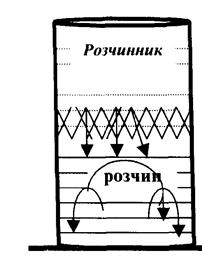 Сольватацію можна розглядати на прикладі розчинення кристалів солі NaCl у воді (рис.5). Диполі води орієнтуються навкруги від’ємних іонів хлору своїм позитивним полюсом, а навкруги позитивних іонів натрію – від’ємним, тобто відбувається гідратація іонів. В результаті цього процесу зв’язок між поверхнево розташованими іонами в кристалі хлористого натрію послаблюється. Іони натрію і хлору відриваються від кристалу, а молекули води утворюють навкруги них так звану гідратну оболонку. Процес розчинення у воді NaCl практично не має теплового ефекту, бо енергія гідратації майже дорівнює енергії руйнування кристалу. При розчиненні у воді КСl з досить стійкою кристалічною граткою, іони К+ і Сl- гідратуються і енергія ΔН1, що виділяється при цьому, компенсує більшу частину енергії ΔН2, необхідної для руйнування кристалічної гратки. Отже, за абсолютним значенням ΔН2 >ΔН1 і при розчиненні КСl у воді теплота буде поглинатися з оточуючого середовища, тобто цей процес ендотермічний. Розчинність кристалогідрату CuCl2∙2H2O супроводжується виділенням теплоти, тобто процес екзотермічний, бо енергія гідратації значно перевищує енергію руйнування твердого тіла. Знак теплового ефекту визначає і вплив температури на розчинність. Процес розчинення більшості твердих речовин ендотермічний і з підвищенням температури розчинність збільшується. Для деяких речовин з підвищенням температури розчинність зменшується, оскільки процес їх розчинення екзотермічний. Розчинність твердих речовин завжди обмежена. Але абсолютно нерозчинних речовин в природі не існує, хоча і є речовини, практично не розчинні у воді. До них можна віднести BaSO4, CaCO3, CuS, AgCl та інші. Як і будь-який фізико-хімічний процес, процес розчинення підкоряється певним закономірностям. Відомо, що швидкість хімічних процесів залежить від температури. Аналогічно, швидкість розчинення речовин при підвищенні температури збільшується, отже, збільшується і розчинність. На швидкість розчинення впливають дифузія та ступінь подрібнення речовини. Швидкість переходу речовини з кристала в розчин, тобто швидкість гідратації, на два порядки більша, ніж швидкість дифузії гідратованої молекули (чи іона) у глибину розчину. Тому для того, щоб збільшити швидкість розчинення, розчин необхідно перемішувати. При цьому збільшується швидкість дифузії гідратованих частинок у розчин. Оскільки процес розчинення відбувається лише на поверхні розподілу фаз, то чим більшою є ступінь подрібнення речовин, тим більшою є його питома поверхня і, отже, вищою є швидкість розчинення. 4. ДИФУЗІЯ І ОСМОС В РОЗЧИНАХ. ЗАКОН ВАНТ-ГОФФА Якщо в стакан із зафарбованим розчином якої-небудь речовини обережно влити розчинник, то на початку між шарами розчину і розчинника буде спостерігатися чітка межа розподілу. Поступово межа розділу розмивається і через деякий час весь об'єм рідини набуває рівномірного зафарбування. Це відбувається в наслідок дифузії. Дифузія - самовільний переніс рідини з області з більшою концентрацією в область з меншою концентрацією, або іншими словами це самовільний процес вирівнювання концентрацій. В наведеному прикладі розчинена речовина з нижнього шару дифундує в шар чистого розчинника, а молекули розчинника переходять в шар розчину, де концентрація їх менше. Цей процес двосторонньої дифузії закінчитьс