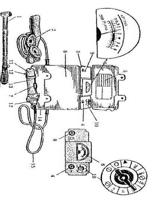 1 - подовжувальна штанга; 2 - телефони; 3 - панель вимірювального приладу; 4 - кнопка скидання показників; 5 - норми забрудненості; 6 - мікроамперметр; 7 - контрольне джерело випромінювання; 8 - футляр приладу; 9 – тумблер підсвічування шкали; 10 - перемикач піддіапазонів; 11 - блок детектування; 12 - опорні фіксатори; 13 - поворотний екран; 14 - камера для блока детектування; 15 - кабель блока детектування. Рисунок 1 - Прилад ДП-5В Зонд і блок детектування - це сталевий циліндричний корпус 11 з вікном для індикації бета-випромінювання, закритим етилцелюлозною водостійкою плівкою, крізь яку проникають бета-частинки. На корпус надітий металевий поворотний екран 13, який фіксується у двох положеннях (Г і Б) на зонді приладів ДП-5А, ДП-5Б і в трьох положеннях (Г, Б і К) на блоці детектування приладу ДП-5В. Вікно корпуса в положенні Г закривається екраном 13 і в лічильник можуть проникати тільки γ-промені. Повертаючи екран у положення Б, вікно корпуса відкривається і бета-частинки проникають у лічильник. У заглибленні на екрані розміщене контрольне джерело β-випромінювання 7. Встановивши в положенні К джерело бета-випромінювання проти вікна, можна перевірити прилад. Зонд і блок детектування на корпусах мають по два опорних фіксатори 12, за допомогою яких вони встановлюються на обстежувані поверхні при індикації забруднення бета-частинками. У корпусі знаходяться газорозрядний лічильник, електрична схема і підсилювач - нормалізатор. Телефон 2 складається з двох малогабаритних телефонів ТГ-7М, підключається до вимірювального пульта і фіксує наявність радіоактивних випромінювань. Для підготовки приладу до роботи слід вийняти його з укладального ящика, відкрити кришку футляра, оглянути прилад, пристебнути до футляра паси. Дістати зонд або блок детектування, приєднати ручку до зонда, а до блока детектування - штангу 1. Підключити джерело живлення. Включити прилад, встановити ручки перемикачів піддіапазонів у положення; приладу ДП-5А "Реж" і ДП-5В "∆" — контроль режиму, стрілка приладу встановлюється в режимному секторі: в ДП-5А стрілку приладу потенціометром встановити в режимному секторі на "А". Якщо стрілка мікроамперметра не відхиляється або не встановлюється на режимному секторі, необхідно перевірити придатність джерел живлення. За допомогою контрольних джерел потрібно перевірити придатність приладів до роботи. Для цього екрани зонду в ДП-5А, ДП-5Б і блока детектування в ДП-5В встановити відповідно у положеннях БіК. Підключити телефони. В приладах ДП-5А, ДП-5Б відкрити контрольне бета-джерело, встановити зонд опорними фіксаторами на кришку футляра так, щоб джерело знаходилося напроти відкритого вікна зонду. Потім, встановлюючи послідовно ручку перемикача піддіапазонів у положення x1000, х 100, х10, х1 і х0,1, перевірити придатність приладу на всіх діапазонах, крім першого. В телефоні повинен прослуховуватися тріск. При цьому стрілка мікроамперметра має зашкалювати на 6 і 5-му піддіапазонах, відхилятися на 4-му, а на 3 і 2-му може не відхилятися через недостатню активність контрольного джерела. На 6 піддіапазоні тріск у телефоні може періодично перериватися через велику активність контрольногоджерела для цього піддіапазону. Після цього ручки перемикачів встановити в положення "Викл" ДП-5А, ДП-5Б і "∆" ДП-5В; натиснути кнопки "Сброс"; повернути екрани в положення Г. Прилади пе