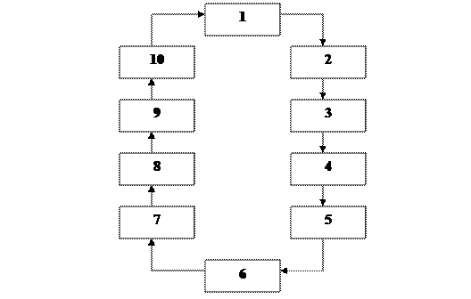 Рис.11.1. Процедура подготовки и принятия управленческих решений, где: 1- выявление и признание проблемы; 2- формулирование проблемы; 3- определение критериев выбора решения; 4- разработка альтернатив; 5- выбор наилучшей альтернативы; 6- согласование решения; 7- организация выполнения решения; 8- контроль исполнения решения; 9- внесение необходимых корректив; 10- анализ и обратная связь.