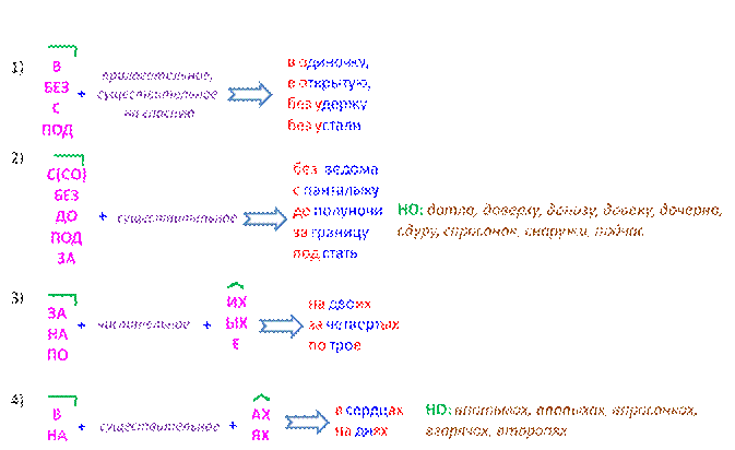 вдребезги, впросак, воочию, вкупе, навзничь, навзрыд, наизусть, наотмашь, натощак, наискосок, насмарку, поодаль, понаслышке, невдомек, невзначай.