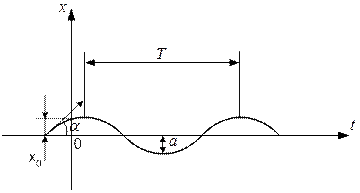 Розглянутий прямолінійний рух матеріальної точки М масою m під дією сили Період коливань Т – проміжок часу між двома послідовними проходженнями точки через положення статичної рівноваги в певному фіксованому напрямку. Колова частота власних коливань К і їх період Т не залежать від початкових умов і амплітуди коливань а. Коли одночасно початкові умови дорівнюють нулю Графік вільних коливань наведений на рис. 2. На цьому графіку відмічені початкове відхилення х0 амплітуди коливань а та період Т.