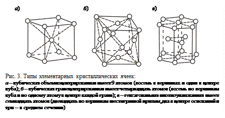 Наиболее распространены три типа элементарных кристаллических ячеек металлов (рис. 3): кубическая объемноцентрированная (хром, вольфрам, молибден, железо (до 910° и от 1400 до 1539°С), титан (при температурах свыше 882°С)), кубическая гранецентрированная (алюминий, медь, никель, свинец, золото, серебро, железо (при 910–1400°С)) и гексагональная (цинк, магний, бериллий, титан (до 882°С)). Атомы металлов образуют кристаллические решетки благодаря наличию особой металлической связи. В узлах кристаллических решеток металлов расположены положительно заряженные ионы, удерживаемые на определенном расстоянии друг от друга свободными электронами. Такое внутреннее строение обусловливает характерные признаки металлов, такие, как электро- и теплопроводность, пластичность. Свойства металлов зависят не только от типа кристаллической решетки, но и от расстояния между атомами. Геометрическая правильность расположения атомов в кристаллических решетках придает металлам особенности, которых нет у аморфных тел. Первой особенностью металлов является анизотропия свойств кристаллов, т. е. различие свойств кристаллов в разных направлениях. Анизотропия объясняется неодинаковой плотностью атомов в разных плоскостях кристаллической решетки, так как расстояния между атомами в решетках в разных направлениях неодинаковы. В отличие от кристаллических тел аморфные тела изотропны, т. е. их свойства не зависят от направления. У металлических тел анизотропия свойств не выражена так резко, как у отдельных кристаллов. Металлы являются поликристаллическими телами, т. е. они состоят не из одного, а из бесчисленного множества кристаллов, по-разному ориентированных. Произвольность ориентировки каждого кристалла приводит к тому, что в любом направлении располагается приблизительно одинаковое количество различно ориентированных кристаллов. В результате получается, что свойства поликристаллических тел будут в среднем одинаковы во всех направлениях. Это явление называется квазиизотропией (ложной изотропией). Второй особенностью металлов как тел кристаллического строения является наличие у них плоскостей скольжения (спайности). По этим плоскостям происходит сдвиг или отрыв (разрушение) частиц кристаллов под действием внешних усилий. У аморфных тел смещение частиц происходит не по определенным плоскостям, а беспорядочно. Излом аморфного тела всегда имеет неправильную, искривленную форму. Третьей особенностью металлов как тел кристаллического строения является то, что процесс перехода их из твердого состояния в жидкое и наоборот происходит при определенной температуре, называемой температурой плавления (затвердевания). Аморфные тела переходят в жидкое состояние постепенно и не имеют определенной температуры плавления.