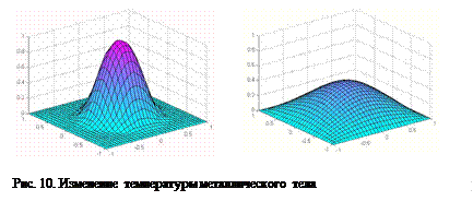 Металлы и сплавы подвергаются статистическим испытаниям на растяжение, при помощи которых можно судить о прочности, упругости и пластичности. Прочность – это способность материала сопротивляться действию внешних сил без разрушения. Упругость – это способность материала восстанавливать свою первоначальную форму и размеры после прекращения действия внешних сил, вызвавших деформацию. Пластичность – это способность материала изменять свою форму и размеры под действием внешних сил, не разрушаясь, и сохранять полученные деформации после прекращения действия внешних сил. Статистическим испытаниям на растяжение подвергаются образцы стандартной формы и размеров на специальных разрывных машинах. Растягивающие усилия разрывной машины вызывают удлинение образца вплоть до его разрушения. Не производя статистических испытаний на растяжение, о прочностных свойствах можно судить по величине твердости металлов. Твердость – это способность материала оказывать сопротивление проникновению в него другого, более твердого тела. Твердость тесно связана с обрабатываемостью и износостойкостью металлов. Наибольшее распространение получили следующие методы определения твердости металлов: 1) вдавливанием стального шарика (метод Бринелля); 2) по глубине вдавливания алмазного конуса или стального шарика малого диаметра (метод Роквелла); 3) вдавливанием алмазной пирамиды (метод Виккерса). Кроме испытаний, направленных на выявление механических свойств, проводятся исследования электро- и теплопроводности образцов металлов и сплавов. Приведен листинг программы в MatLab, которая демонстрирует изменение распространения температуры металлического тела в зависимости от коэффициента теплопроводности. Результат выполнения программы – изменение температуры на графике в динамике (рис. 10). g='squareg'; % Единица площади b='squareb1'; % Нулевое значение на границе c = input('Koiffisient teploprovodnosti '); a=0; f=1; d=1; Построение графика: [p,e,t]=initmesh(g); Начальные условия: u0=zeros(size(p,2),1); ix=find(sqrt(p(1,:).^2+p(2,:).^2)<0.4); u0(ix)=ones(size(ix)); Число колебаний графика: nframes=20; tlist=linspace(0,0.1,nframes); Решение уравнения теплопроводности: u1=parabolic(u0,tlist,b,p,e,t,c,a,f,d); Вывод графика: x=linspace(-1,1,31);y=x; [unused,tn,a2,a3]=tri2grid(p,t,u0,x,y); Анимация: newplot; Mv = moviein(nframes); umax=max(max(u1)); umin=min(min(u1)); for j=1:nframes,... u=tri2grid(p,t,u1(:,j),tn,a2,a3);i=find(isnan(u));u(i)=zeros(size(i));... surf(x,y,u);caxis([umin umax]);colormap(cool),...