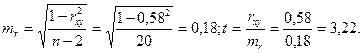 3. Определяем статистическую значимость коэффициента корреляции Пирсона тремя способами: 1-й способ: В табл. XIII Приложений находим критические значения коэффициента для 1-го и 2-го уровней значимости: rкр. = 0,42; 0,54 (ν = n – 2 = 20). Делаем вывод о том, r xy > r кр. , т. е. корреляция является статистически значимой для обоих уровней. 2-й способ: Воспользуемся табл. XV, в которой определяем число пар значений (число испытуемых), достаточное для статистической значимости коэффициента корреляции Пирсона, равного 0,58: для 1-го, 2-го и 3-го уровней значимости оно составляет, соответственно, 12, 18 и 28. Отсюда мы делаем вывод о том, что коэффициент корреляции является значимым для 1-го и 2-го уровня, но «не дотягивает» до 3-го уровня значимости. 3-й способ: Вычисляем ошибку коэффициента корреляции и коэффициент Стьюдента как отношение коэффициента Пирсона к ошибке: