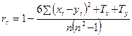x i x i x i а б в Рис. 8.2. Возможные источники ошибок при интерпретации величины коэффициента корреляции (объяснения в тексте (пункты 3 – 5 примечания)) 8. 5. Коэффициент ранговой корреляции Спирмена Коэффициент корреляции Спирмена (rs) используется в тех случаях, когда оба ряда переменных представлены ранговыми (порядковыми) шкалами. Для вычисления коэффициента Спирмена можно пользоваться двумя разными формулами, которые дают, в принципе, один и тот же результат: 1) 2) Коэффициенткорреляции Спирмена, так же как и rxy, может варьировать от –1 до +1. rs = 1 только в том случае, когда ранги обоих признаков в точности совпадают по х и у. При расчете коэффициента Спирмена вручную (на микрокалькуляторе) рекомендуется использовать рабочую таблицу для промежуточных вычислений, которая имеет следующий вид: