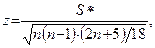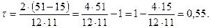 В табл. XIV Приложений находятся критические значения коэффициента для данной выборки: τкр. = 0,45; 0,59. Эмпирически полученное значение сравнивается с табличным. Вывод τ = 0,55 > τкр. = 0,45. Корреляция статистически значима для 1-го уровня. Примечание: При необходимости (например, при отсутствии таблицы критических значений) статистическая значимость t Кендалла может быть определена по формуле следующего вида: