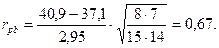 В нашем примере: p x = 100:250 = 0,40; q x = 1 – 0,40 = 0,60; p y = 120:250 = 0,50; qy = 1 – 0,50 = 0,50; p xy = 40:250 = 0,16. Подставляя значения в формулу, получаем: φ = –0,163. Вывод подтверждается. 8. 8. Точечный бисериальный коэффициент корреляции (r pb) Точечный бисериальный коэффициент корреляции используется тогда, когда одна переменная формирует дихотомическую шкалу наименований, другая – шкалу интервалов или шкалу отношений. Порядок вычислений коэффициента рассмотрим на примере следующей задачи. Условие задачи В группе испытуемых, протестированных по тесту Айзенка, обнаружено 15 экстравертов, из них 8 с высоким уровнем нейротизма (холерики) и 7 – с низким нейротизмом (сангвиники). Тест Спилбергера обнаружил у тех и других следующий уровень личностной тревожности (УЛТ): Таблица 8.7