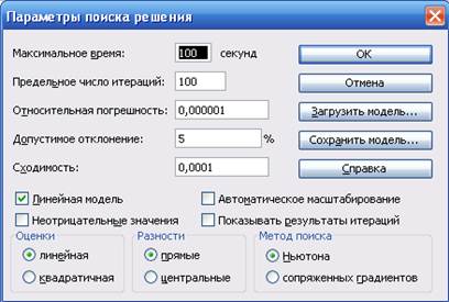 Збереження (завантаження) різних даних для пошуку рішення здійснюється за допомогою кнопок Сохранить модель і Загрузить модель, відповідно, вікна Параметры поиска решения. Побудова математичної моделі задачі оптимізації. Робота по вирішенню певної оптимізаційної задачі починається з побудови математичної моделі, для чого потрібно відповісти на такі питання: v Які змінні моделі (для визначення яких величин будується модель)? v Яке цільове значення функції (мета, для досягнення якої з множини всіх допустимих значень змінних обираються оптимальні)? v Яким обмеженням повинні задовольняти невідомі? При конструюванні математичної моделі формулювання обмежень є найвідповідальнішою частиною. У деяких випадках обмеження є очевидними, наприклад, обмеження на кількість сировини. Інші обмеження можуть бути вказані невірно. Наприклад: v В моделі з кількома періодами часу величина матеріального ресурсу на початок наступного періоду повинна дорівнювати величині цього ресурсу на кінець попереднього періоду. v В моделі поставок величина запасу на початок періоду плюс кількість отриманого повинна дорівнювати величині запасу на кінець періоду плюс кількість відправленого. v Більшість величин в моделі за своїм фізичним сенсом не можуть бути від’ємними. При максимізації цільової функції область допустимих значень повинна бути обмежена згори, при мінімізації – знизу. Більшу частину задач оптимізації являють собою задачі лінійного програмування, у яких критерій оптимізації та обмеження – лінійні функції. В цьому випадку для вирішення задачі слід встановити прапорець Линейная модель у вікні Параметры поиска решения, що забезпечить використання симплекс-методу, інакше будуть використовуватись більш загальні (більш повільні) методи. Пошук рішення може працювати також з нелінійними залежностями та обмеженнями. Це задачі нелінійного програмування, наприклад, вирішення системи нелінійних рівнянь. Вирішуючи задачі з нелінійними залежностями, слід: v ввести початкові значення змінних для подальшого пошуку, наприклад, виконавши графічне представлення рішення, зробивши наближені припущення про рішення; v у вікні Параметры поиска решении зняти прапорець Линейная модель. Можна отримати звіт про пошук рішення. Звіти бувають трьох типів: v Отчет по результатам вміщує кінцеві значення параметрів задачі цільової функції та обмежень; v Отчет по устойчивости показує результати малих змін параметрів пошуку рішення; v Отчет по пределам показує зміни рішення при виконанні почергової максимізації і мінімізації кожної змінної за умови незмінюваності інших змінних.