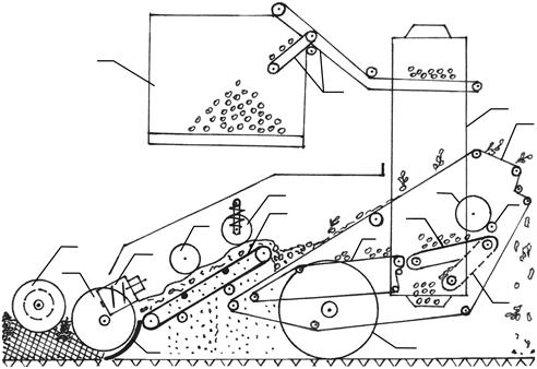 1 - лемех; 2 - опорный каток; 3 - выкапывающие диски; 4 - шнек; 5 - элеватор передний; 6 – сепа-ратор шнековый; 7 – комкодави-тель; 8 - элеватор задний; 9 - ботвоудалитель; 10 - горка основ-ная; 11 - транспортер подъема; 12 - ходовые колеса; 13 - бункер; 14 - транспортер-загрузчик бун-кера; 15 - горка дополнительная; 16 – ограничительный брус