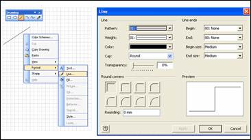 Главным из перечисленных инструментов можно считать Pencil Tool, так как он объединяет возможности, присущие всем остальным. Например, с его помощью можно нарисовать как линию, так и дугу. Однако его главная задача состоит не в этом — он предназначен для изменения формы фигур, вставленных из трафарета. Пример его использования рассматривался при обсуждении маркеров вершин в пункте «Маркеры фигуры». Модифицирование стандартной фигуры является одним из основных и самых быстрых способов получения пользовательской фигуры. После выбора инструмента Pencil Tool маркеры выделения, находящиеся в вершинах ограничивающего прямоугольника, превратятся в маркеры вершины, боковые маркеры станут точками контроля, а указатель мыши примет вид карандаша. Перемещая маркеры, можно добиться необходимого вида фигуры. Однако может понадобиться или, наоборот, стать лишней еще одна вершина. Что делать в этом случае? В такой ситуации нужно удалить ненужную или добавить новую вершину. Для того чтобы удалить вершину, выделите ее с помощью инструмента Pencil Tool, щелкнув по ней левой кнопкой мыши, и нажмите клавишу Delete. После этого указанная вершина будет удалена, а соседние с ней — соединены прямой. Чтобы добавить новую вершину, нажмите клавишу Ctrl и, удерживая ее, укажите инструментом Pencil Tool точку на контуре фигуры, куда нужно вставить вершину. Вместе с новой вершиной на половине расстояния до ближайшей уже существующей вершины фигуры добавится новая точка контроля. Инструмент Line Tool позволяет рисовать прямые линии. При использовании этого инструмента указатель мыши принимает вид крестика, подчеркнутого линией, а из всех маркеров выделенных фигур остаются только маркеры вершин. Во время работы с инструментом Line Tool можно заметить деление листа на узлы — при перемещении указателя он двигается не плавно, как в обычных ситуациях, а скачками от узла к узлу. Чтобы нарисовать линию при помощи инструмента Line Tool, нужно выбрать его, нажать левую кнопку мыши и, удерживая ее, провести в нужном направлении линию необходимой длины. В работе с этим инструментом существует несколько тонкостей. Например, если удерживать нажатой клавишу Shift, то угол наклона линии всегда будет кратен 45°. Для создания ломаной линии, как замкнутой, так и незамкнутой, также можно использовать инструмент Line Tool. Чтобы создать связанную последовательность отрезков, выполните следующие действия. 1. Выберите инструмент Line Tool. 2. Нарисуйте первый отрезок. 3. Установите указатель мыши в один из концов созданного отрезка. Указатель примет вид крестика. 4. Нарисуйте следующий отрезок. 5. Повторите шаги 3 и 4 для создания нужной фигуры. 6. Для создания замкнутой фигуры проведите линию из конечной точки последнего отрезка в начальную точку первого отрезка. Замкнутая фигура будет автоматически закрашена белым цветом. Такой метод наиболее удобен, когда требуемая пользовательская фигура может быть составлена из нескольких стандартных. Простая линия может не представлять большого интереса, однако у нее имеется много различных форматов, которые позволяют создавать множество фигур. Для преобразования линии выберите команду Format ► Line. Открывшееся окно Диалога Line содержит параметры, позволяющие изменить толщину линии, ее тип и цвет. Здесь же в разделе Line ends можно отредактировать вид окончания линии. Результат приме