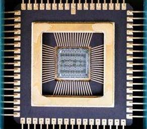 Fig. 4.2 Photo by courtesy of NASA Glenn Researech Center (NASA-GLC). 1) A traditional printed circuit board (PCB) like this has tracks linking together the terminals (metal connecting legs) from different electronic components. Think of the tracks as "streets" making paths between "buildings" where useful things are done (the components themselves). There's a miniaturized version of a circuit board inside an integrated circuit: the tracks are created in microscopic form on the surface of a silicon wafer. 2) If you could lift the cover off a typical microchip, this is what you'd find inside. The integrated circuit is the tiny square in the center. Connections run out from it to the terminals (metal pins or legs) around the edge. When you hook up something to one of these terminals, you're actually connecting into the circuit itself. You can just see the pattern of electronic components on the surface of the chip itself. 3) This is what an IC looks like when it's conveniently packaged inside a flash memory chip. Inside the black protective case, there's a tiny integrated circuit, with millions of transistors capable of storing millions of binary digits of information.