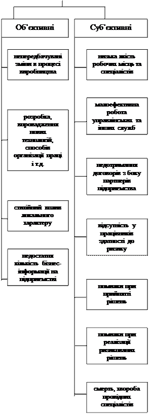 Рис. 2.2. Причини виникнення фінансових ризиків Віднесення фактора до тієї чи іншої групи залежить від розглядуваного рівня управління (цех, дільниця, підприємство, об’єднання підприємств, галузь) та тривалості періоду реалізації прийнятого рішення. Необхідно наголосити, що з огляду на природу економічного ризику множина пізнаних й ідентифікованих чинників не може бути вичерпною цілком. Це суперечить основним підходам щодо онтології та гносеології ризику, філософії людського буття. Не секрет, що об’єктивно існує множина ідентифікованих чинників, але реально існують і латентні (на даний час) чинники. Тому однією з проблем є виявлення, ідентифікація й аналіз нових чинників ризику, адже важливо пам’ятати, що соціально-економічне буття весь час трансформується, ситуації змінюються. Отже, систематизація чинників ризику є відкритою, тобто має будуватись таким чином, щоб залишалась можливість її поповнення новими чинниками, а також їх узгодженість між собою. Розглянуті фактори ризику по-різному впливають на діяльність суб’єктів підприємницької діяльності, кожен із них має вагомий вплив на ступінь ризику, що підтверджує важливість постійного аналізу і контролю за відповідними факторами виникнення ризику з метою забезпечення ефективної діяльності підприємства.