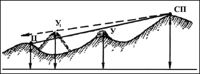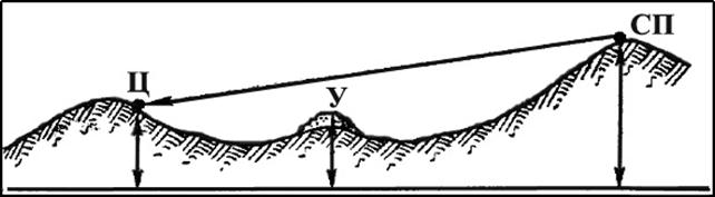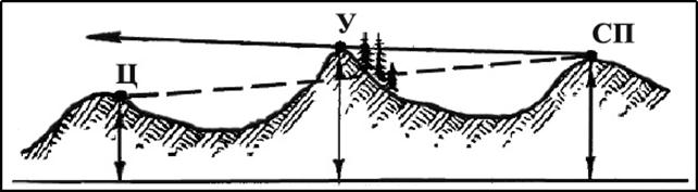 Ø якщо між спостерігачем (СП) і ціллю (Ц) є укриття (У), яке має більшу за величиною позначку, ніж відмітка СП) і Ц, то видимість між СП) і (Ц) відсутня, рис.1.55;