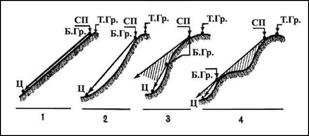 Ø якщо точки знаходяться на одному схилі, то видимість між ними буде залежати від форми цього схилу, рис.1.57, на рівному і вигнутому схилах всі точки звичайно спостерігаються, якщо не перешкоджає рослинність або місцеві предмети, а на випуклому і хвилястому схилах такої видимості може і не бути.