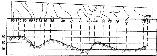 а) прикладають до профільної лінії міліметровий або розграфлений папір і переносять на його край короткими вертикальними рисками всі горизонталі, які пересікають профільну лінію. Одночасно підписують навколо кожної риски абсолютну відмітку горизонталі. Якщо позначка горизонталі виражається тризначним числом, то можна підписувати тільки останні дві цифри, щоб не закривати креслення;