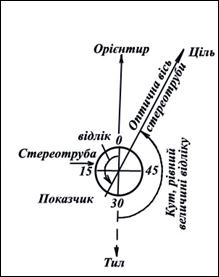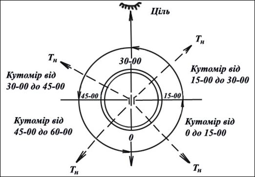 Установка кутоміра (відліку) визначає напрямок наведеної гармати (приладу). Тому за величиною установки кутоміра можна знати відносне розташування цілі і точки наведення, рис.3.9, а за відліком – розташування цілі відносно напрямку, у якому орієнтовано прилад.