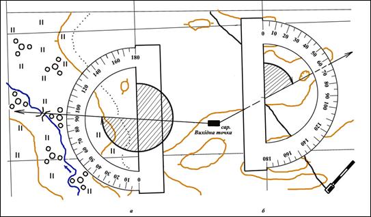 Рисунок 3.26 – Вимірювання дирекційних кутів транспортиром: а – дирекційний кут напрямку на міст дорівнює 2740; б – дирекційний кут на яму Вихідну точку і місцевий предмет (ціль) з’єднують прямою лінією, довжина якої від точки її перетину з вертикальною лінією координатної сітки повинна бути більше радіуса транспортира. Потім суміщають транспортир з вертикальною лінією координатної сітки (тобто поділки 0 і 1800 на транспортирі) відповідно до величини кута. Відлік по шкалі транспортира проти накресленої лінії буде відповідати величині дирекційного кута, що вимірюється. Середня помилка вимірювання кута транспортиром офіцерської лінійки становить 0,50 (0-08). Вимірювання кутів за допомогою АК-3 проводиться так, рис.3.27.