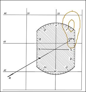Рисунок 3.27 – Вимірювання дирекційного кута на карті артилерійським кругом Примітка. Під час вимірювання дирекційного кута артилерійським кругом потрібно накласти центр круга на точку перетину напрямку, що визначається, з вертикальною кілометровою сіткою, сумістити нульовий штрих круга з північним напрямком цієї кілометрової лінії, як показано на рис.3.28 б. Величину дирекційного кута отримаємо, взявши відлік по шкалі круга проти напрямку, що визначається, користуючись червоною оцифровкою поділок шкали, яка збільшується за ходом годинникової стрілки 1.Якщо напрямки на точки, між якими потрібно виміряти кут, на карті (планшеті) накреслені, то накладають круг центром на точку – вершину кута і, сумістивши нульову поділку круга з одним із напрямків, читають величину кута по шкалі круга у місці перетину її з напрямком на другу точку. Інтерполяцію між поділками шкали проводять окомірно. 2.Якщо напрямки на точки, між якими потрібно виміряти кут, не накреслені, тоді: Ø з’єднують круг з лінійкою, накладаючи центр круга на точку, з якої вимірюють кут; Ø суміщають робочий зріз лінійки з однією із точок і, утримуючи лінійку у цьому положенні, повертають круг, підводячи нульову поділку його шкали до обрізу лінійки; Ø не збиваючи установленого круга, шляхом повертання лінійки суміщають її зріз з іншою точкою і читають по шкалі круга біля зрізу лінійки величину виміряного кута. Середня помилка вимірювання кута артилерійським кругом становить 0-03 (10’). Для побудови кута до заданого напрямку на карті (планшеті) накладають круг так, щоб центр його збігся з точкою, з якої будують кут, а нульове значення шкали круга сумістилося із заданим напрямком, що накреслений на карті. Проти поділки шкали круга, що відповідає величині заданого кута, наносять точку, яку потім з’єднують прямою лінією з вершиною кута. Для визначення дирекційного кута заданого на карті (планшеті) напрямку, наприклад, напрямку з точки А на точку В, слід: Ø накласти круг, з’єднаний з лінійкою, центром на точку, з якої визначається кут (точка А); Ø користуючись паралельними лініями, що нанесені на кругу, установити 30-00 паралельно вертикальним лініям координатної сітки (нульова поділка на північ); Ø утримуючи круг в установленому положенні, сумістити робочий зріз лінійки з точкою, на яку визначається кут (точка В), і, користуючись оцифровкою шкали круга, що нанесена за ходом годинникової стрілки (цифри червоного кольору), прочитати проти зрізу лінійки величину дирекційного кута. Креслення на карті (планшеті) напрямку по заданому дирекційному куту проводять у такому порядку: Ø накладають круг центром на точку, для якої необхідно накреслити заданий напрямок, і установлюють позначку 30-00 паралельно лініям координатної сітки нульовою поділкою на північ; Ø проти поділки шкали, що відповідає заданому дирекційному куту (за цифрами червоного кольору), наносять на карту (планшет) точку і з’єднують її прямою лінією з початковою точкою. Примітка. Для побудови на карті у будь-якій точці дирекційного кута проводять через цю точку пряму, паралельну вертикальним лініям координатної сітки, і від цієї прямої будують заданий дирекційний кут.