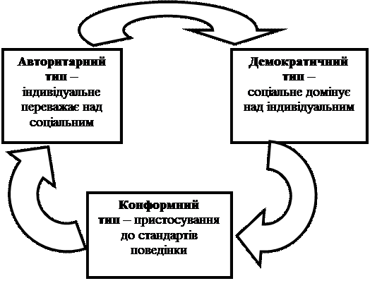 Духовна сила, розвиток особистості, її цілісність, надійність вимірюються саме за тим, настільки стійкі ціннісні орієнтації особистості. Якщо вони слабкі, особистість є інфантильною, схильна змінювати свою позицію від найменшої зміни зовнішніх обставин. Це виявляється у різних формах – від дрібних фактів “моральної нестійкості” до зради державних інтересів. Існує типологія особистості, яка розглядає співвідношення соціальних і індивідуальних чинників в діяльності і поведінці людини: Традиціоналісти орієнтовані переважно на цінності обов’язку, порядку, дисципліни, поваги до закону; вияв же таких якостей, як прагнення самореалізації, самостійність у цього типу досить низька. У ідеалістів, навпаки, сильніше виявляються критичне ставлення до традиційних норм, незалежність, ігнорування авторитетів, установки на саморозвиток будь-якою ціною. Фрустрований тип особистості має низьку самооцінку, відчуває пригніченість, відокремленість себе від течії життя. Гедоністи орієнтовані передусім на одержання задоволення споживацьких бажань. Соціальний тип особистості – це відображення того, як суспільство впливає на ціннісні орієнтації людини і через них – на її реальну поведінку. В залежності від ціннісних орієнтацій в сучасній соціології виділяють кілька типів особистості:
