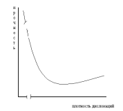 Присутствие в кристаллической решетке дислокаций оказывает существенное влияние на механические и электрические свойства материалов. При полном отсутствии дислокаций прочность кристаллов была бы равна теоретической. Подтверждением этого положения является создание кристаллов малого диаметра, так называемых "усов". Усы практически свободны от дислокаций, и их прочность приближается к теоретической. В обычных материалах дислокации всегда присутствуют, поэтому их прочность существенно ниже теоретической. Важно отметить, что при повышении плотности дислокаций в обычных материалах их прочность возрастает. Это связано с тем, что в ядре дислокации кристаллическая решетка искажена, а следовательно, дислокации окружены полями упругих напряжений. При увеличении плотности дислокаций поля упругих напряжений перекрываются, дислокации взаимодействуют друг с другом, и перемещение дислокаций затрудняется. Хотя прочность материалов с повышенной плотностью дислокаций всего лишь в два - три раза выше прочности материалов с обычной плотностью дислокаций, повышение прочности за счет повышения плотности дислокаций имеет большой практический интерес. Дело в том, что повышение плотности дислокаций легко провести путем холодной пластической деформации. Испокон веков прежде чем точить косу, крестьяне отбивали ее, то есть ударяли по режущей часть лезвия косы молотком. При этом режущая часть упрочнялась и меньше тупилась при работе. Повышение прочности металлов в ходе холодной пластической деформации называют наклепом, или нагартовкой. Зависимость прочности металлических материалов от плотности дислокаций показана на рис. 16. Наличие в материале дислокаций резко повышает скорость диффузии. Это связано с тем, что дислокации могут являться источниками и стоками вакансий. При испускании вакансий дислокации переползают на плоскость лежащую выше, а при поглощении вакансий дислокации переползают на плоскость, лежащую ниже исходной плоскости. Таким образом, наличие дислокаций повышает локальную концентрацию вакансий, а следовательно, ускоряет диффузию. Опытные мастера, прежде чем затачивать жало паяльника, отбивают его. Тогда при облуживании жала припоем, олово, входящее в состав припоя, диффундирует в медное жало, и на поверхности жала образуется тонкий слой сплава меди с оловом – бронзы. Коррозионная стойкость материала повышается, и жало паяльника служит дольше. Важно отметить, что решеточные дислокации взаимодействуют с атомами растворенных примесей или легирующих элементов. Как отмечалось выше, вблизи чужеродного атома кристаллическая решетка искажена - растянута или сжата. В ядре дислокации кристаллическая решетка также искажена: под экстраплоскостью кристаллическая решетка растянута, а над экстраплоскостью сжата. Поэтому чужеродные атомы притягиваются к дислокациям, образуя атмосферы Котрелла. При движении дислокаций вместе с ними перемещаются и атмосферы Котрелла, что приводит к затруднению движения дислокаций или к повышению прочности металлических материалов. Поэтому сплавы прочнее чистых металлов. Искажение кристаллической решетки за счет присутствия дислокаций повышает удельное электрическое сопротивление металлических материалов и снижает удельное электрическое сопротивление неметаллических мат