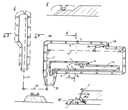 Рис. 7.1. Загальний вигляд кар’єру та його елементи: 1, 8 – верхня бровка розкривного уступу; 2, 7 – нижня бровка розкривного уступу; 3, 6 – верхня бровка видобувного уступу; 4, 5 – нижня бровка видобувного уступу; 9 – капітальна розкривна траншея; 10 – розрізна траншея; 11, 12 – вибої розкривного та видобувного уступів; 13, 14 – екскаватори: роторний і мехлопата; 15 – конвеєри; 16, 17 – укоси уступів; βп, βу – кути укосу бортів уступів по породі і корисній копалині; βн – кут укосу неробочого борта; 1-4, βр – лінія та кут укосу для робочого борту кар’єру