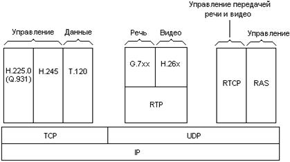 Цель лекции: ознакомление с стеком протоколов H.323. H.323 это не один стандарт, а целая серия стандартов для поддержки передачи речи и видео по сетям без обеспечения качества услуг. Он содержит спецификации алгоритмов кодирования речи и видео, протоколы установления и управления соединениями, меры для обеспечения передачи в реальном времени, интерфейсы с другими сетями и т. д. Стек протоколов H.323, приведен на рисунке 6.1 [7].