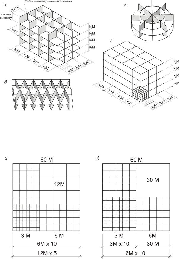 Рисунок 3.2 – Модульна просторова координаційна система: а – прямокутна (переважне застосування); б – косокутна; в – центрична; г – вертикальні й горизонтальні модульні сітки на відповідних площинах цієї системи (k1, k2, k3 – коефіцієнти кратності модулів у плані та по висоті будівлі)