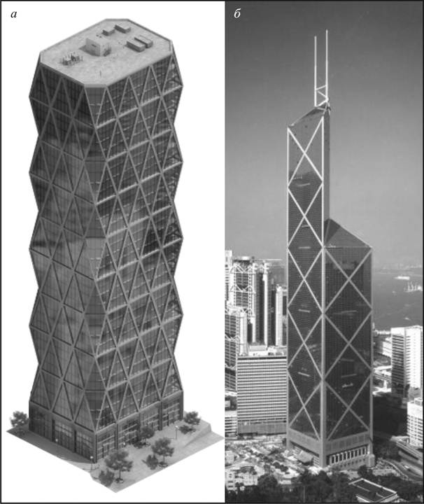Рисунок 5.34 – Взаємозв’язок форми і конструкції в будівлях хай-тека: а – Вежа Херста (Hearst Magazine Tower), Нью-Йорк, США, 2006 р., Foster&Partners (винесений назовні каркас із трикутних чарунок зумовлює форму будівлі); б – Банк Китаю (Bank of China), Гонконг, 1989 – 1990 рр., арх. Й.М. Пей (Pei, Cobb, Freed & Partners) – винесені назовні діагональні в’язі підкреслюють загальну композицію будівлі (дві трикутних призми різної висоти, що в плані разом утворюють квадрат) і ускладнюють метричні ряди на фасадах Значну частину об’єктів хай-тека становили крупні офісні будівлі, в яких узимку основна частина енергії витрачалась на підігрів повітря, що надходило з припливної вентиляції, а влітку – на кондиціювання. Одним з можливих розв’язань цієї проблеми могло б стати зменшення кратності повітрообміну. Але як підтримувати у повітрі оптимальне співвідношення кисню і вуглекислого газу, якого потребують сотні – а часто і тисячі – офісних співробітників? Прийом, який був застосований у будівлі Комерцбанку (Франкфурт-на-Майні, ФРН), полягає у збільшенні внутрішнього об’єму будівлі й озелененні внутрішнього простору (рис. 5.35, б). Крім поліпшення мікроклімату, зимові сади мали сприяти емоційному розвантаженню співробітників, а також поліпшували імідж Комерцбанку, створюючи йому репутацію екологічно відповідальної установи. Подібне масштабне озеленення внутрішнього простору було для свого часу безпрецедентним (атріум та зимові сади займали до третини будівельного об’єму). У будівлі компанії «Swiss Re» (Лондон, Велика Британія) цей прийом був видозмінений. Замість одного атріуму, на який виходили розташовані по спіралі зимові сади – шість спіралеподібних по периметру, котрі слугують також для природного провітрювання. Зазвичай вікна у хмарочосах не відчиняються – наглухо закрита будівля розрахована на примусову вентиляцію та кондиціювання з огляду на велику швидкість повітряних потоків на висоті. Проте у цій будівлі вікна відчиняються, а спеціальна система автоматично відчиняє або зачиняє їх, коли швидкість вітру перевищує певну межу. Форма будівлі розрахована таким чином, щоб повітряні потоки оминали б її, одночасно охолоджуючи (рис. 5.36, в) – тут форма «корнішона» однозначно ефективніша за традиційний паралелепіпед. Ще виразніше вплив фактора енергоефективності на форму будівлі виявлений у лондонській мерії – London City Hall (рис. 5.36, а). Найекономніша форма – куля – немовби нарізана на скибочки-поверхи і деформована таким чином, щоб максимізувати використання сонячної енергії. Для підігріву припливного повітря взимку та його охолодження влітку використовуються теплообмінники, заглиблені у ґрунт (рис. 5.36, б). Легко зауважити, що з середини 1970-их рр. форми будівель хай-тека стали значно пластичнішими, динамічнішими та експресивнішими. Цьому сприяли як функціональні, так і композиційні фактори, а сучасні конструкції та будівельні технології забезпечували реалізацію форм будь-якої складності. Тому закономірним є виникнення течії в архітектурі, що дістала назву органі-тек – біоморфної архітектури, що ґрунтується на найновіших технологічних досягненнях. Яскравим представником цієї течії є Сантьяго Калатрава. Слід відзначити, що біоморфна архітектура, на відміну від архітектурної біоніки, наслідує лише зовнішні форми живих організмів, але необов’язково – принципи їх будо