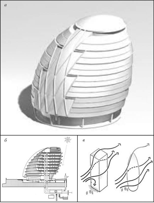 Рисунок 5.36 – Вплив енергоефективності будівлі на її формотворення: а, б – будівля лондонської мерії (London City Hall), Лондон, Велика Британія, 2003 р., Foster&Partners (3D модель та розріз із показом схеми організації вентиляції й кондиціювання з використанням теплових насосів); в – схеми повітряних потоків біля будівлі («Swiss Re») залежно від її форми