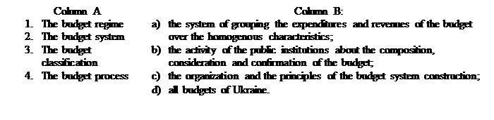 Tests I. Choose the correct answer: 1.A state budget is: a) a sphere of economic relations, where takes place the financial resource’s buying and selling; b) a financial plan of expenditures and revenues of the state; c) a profit from the export and import operations.