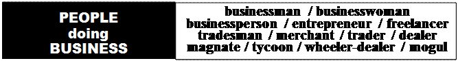 Task 2. Translate into Ukrainian paying special attention to the words in italics. 1. He is a member of the association of small businessmen. 2. Jane works as a freelancer from home. 3. This is a job for a skilled tradesman. 4. China is now one of the largest traders in the world. 5. It is always a good idea to sell through a licensed dealer. 6. The word tycoon entered the English language in the nineteenth century. 7. U.S. President Abraham Lincoln was humorously referred to as the Tycoon by his aides John Nicolay and John Hay. 8. The word mogul originally meant Mongol, or person of Mongolian descent. 9. Many wheeler-dealers have become respectable businessmen. 10. His father was a tea merchant. Task 3. Match the terms in column A with their definitions in column B paying attention to the underlined words.