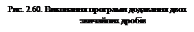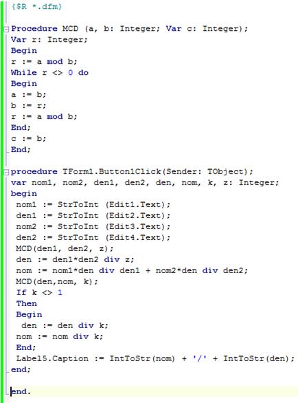У наведеному тексті проекту (рис. 2.59) процедура викликається двічі. Перший раз для знаходження НСД знаменників дробів. Цей НСД у наступній команді використовується для знаходження найменшого спільного знаменника дробів (НСК (х, у) = х*у/НСД(х, у)). Другий – для знаходження НСД чисельника і знаменника дробу-суми з метою його подальшого скорочення. Без використання процедури текст цього проекту збільшився б, погіршилась би його структурованість. Функції користувача в Delphi Як зазначалося вище, процедура може не мати результатів, а може мати один або більше результатів. Якщо процедура має один результат, то зручніше її оформити і викликати як функцію користувача. Функція користувача, як і процедура користувача – це відокремлена частина програми, яка має своє ім’я і яка може бути викликана для виконання в будь-якій іншій частині програми. Відрізняється функція від процедури таким: 1. Рядок заголовка функції виглядає так: function <ім’я> (<списки аргументів з їхніми типами>): <тип результату >; 2. Значення, яке функція повинна повернути (передати) команді, яка її викликає, в тексті самої функції має бути присвоєно змінній, ім’я якої збігається з іменем функції. 3. Функція може бути викликана або в правій частині команди присвоювання, або в команді виведення. Якщо обчислення НСД оформити як функцію, то програма виглядатиме так (рис. 2.61):