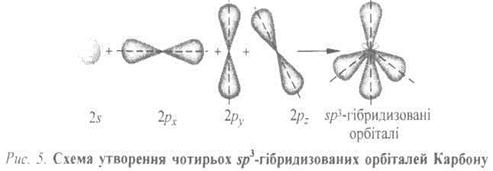 Утворення зв'язків у сполуках Карбону. Збудження атома Карбону. Електронна конфігурація основного стану атома Карбону 1s22s22px2pу:, в якому тільки два неспарені електрони (на 2рх- і 2 р у-орбіталях) можуть брати участь в утворенні зв'язків з іншими атомами. Однак такий висновок суперечить експериментальним даним, згідно з якими в переважній більшості сполук Карбон є чотиривалентним, наприклад метан СН4. Це можливо під час розпаровування електронної пари 2s2 і переходу одного з цих електронів на вакантну 2рz-орбіталь. Унаслідок цього атом Карбону переходить у стан із підвищеною енергією, збуджений стан 1s22s12p1x 2p1y2p1z. У цьому разі він має чотири неспарені електрони замість двох і здатний утворити зв'язки вже не з двома, а з чотирма іншими атомами або групами. Енергія, яка виділяється під час утворення двох додаткових зв'язків, значно перевищує енергію (406 кДж∙моль-1), що необхідна для розпаровування двох 2s2-електронів і переходу 2s → 2р. ПРОСТІ ЗВ'ЯЗКИ sp3-Гібридизація. У збудженому стані атом Карбону має чотири неспарені електрони 2s]2p1х 2p1y2p1z, однак у разі сполучення з чотирма іншими атомами не використовуються одна 2s-орбіталь і три 2р-орбіталі, оскільки це зумовило б утворення трьох взаємноперпендикулярних зв'язків (за рахунок трьох 2р-орбіталей) і одного зв'язку, відмінного від них, який не має напрямленості (за рахунок сферично симетричної 2s -орбіталі). Насправді, чотири С—Н зв'язки, наприклад у метані, рівноцінні й розміщені симетрично (тетраедрично) під кутом 109°28' один відносно одного. Це пояснюється тим, що одна 2s- і три 2р-орбіталі об'єднуються так, щоб утворити чотири нові (ідентичні) орбіталі, спроможні дати міцніші зв'язки (рис. 1).